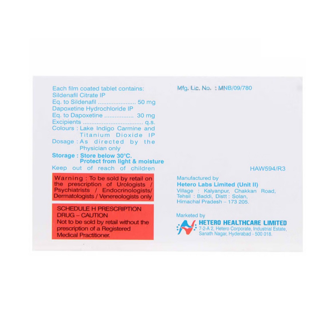 Da Sutra 30X combines two active ingredients, Sildenafil Citrate (50 mg) and Dapoxetine Hydrochloride (30 mg), formulated to treat both erectile dysfunction (ED) and premature ejaculation (PE) in men. This dual-action therapy helps achieve and maintain a firm erection and simultaneously improves control over ejaculation, enhancing overall sexual satisfaction.