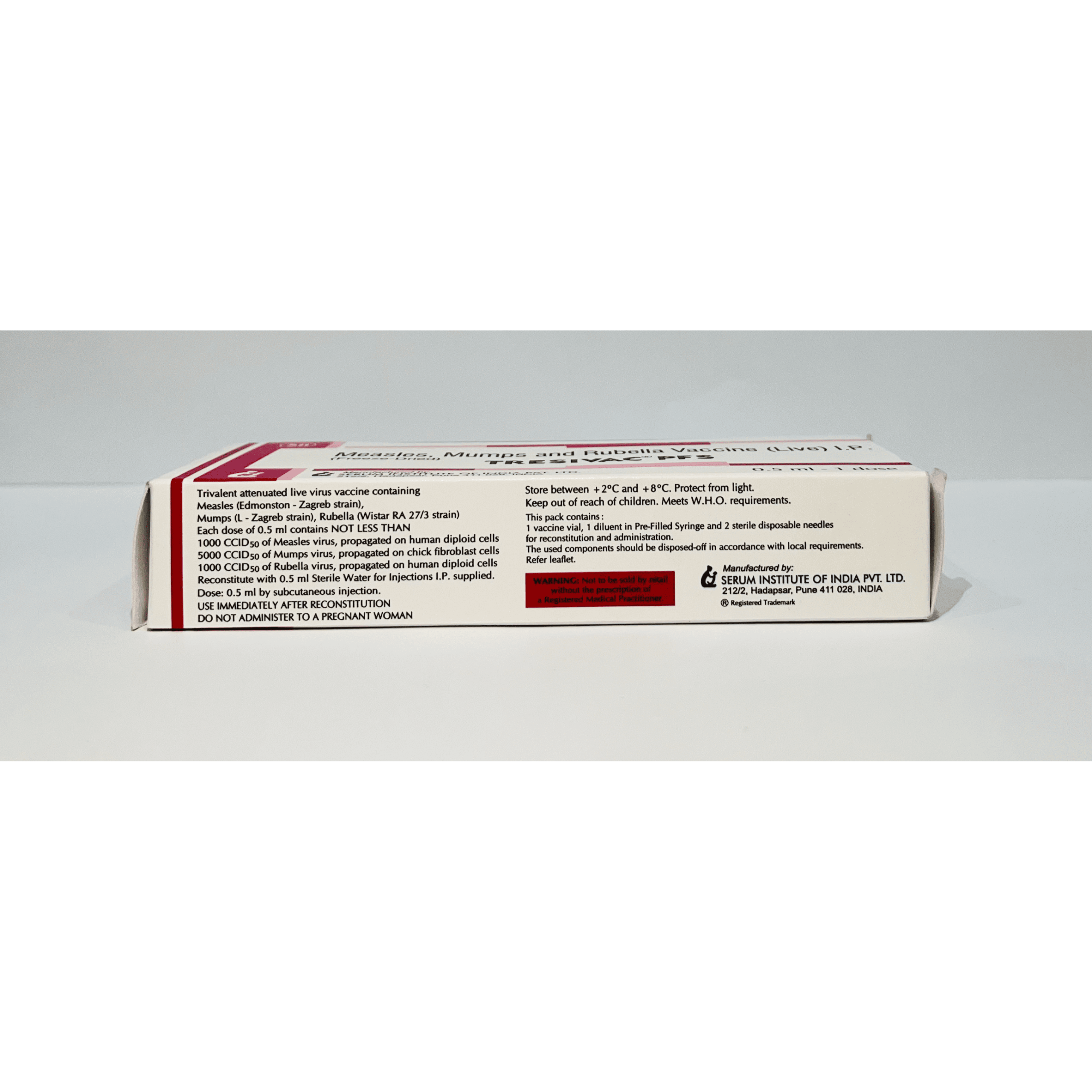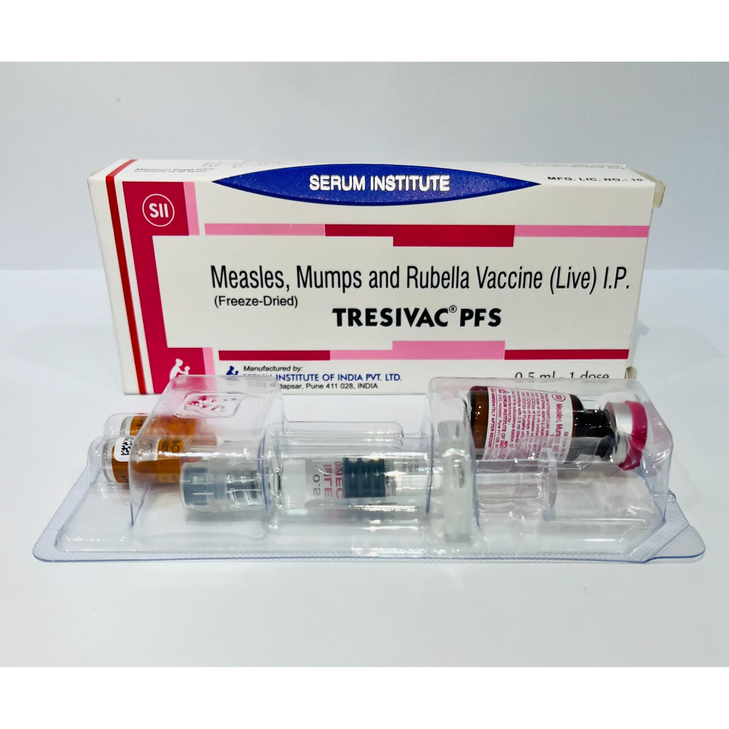Tresivac PFS is a combination vaccine that provides protection against three highly contagious viral diseases — measles, mumps, and rubella. It contains live, attenuated (weakened) strains of each virus to stimulate the immune system without causing the diseases themselves.