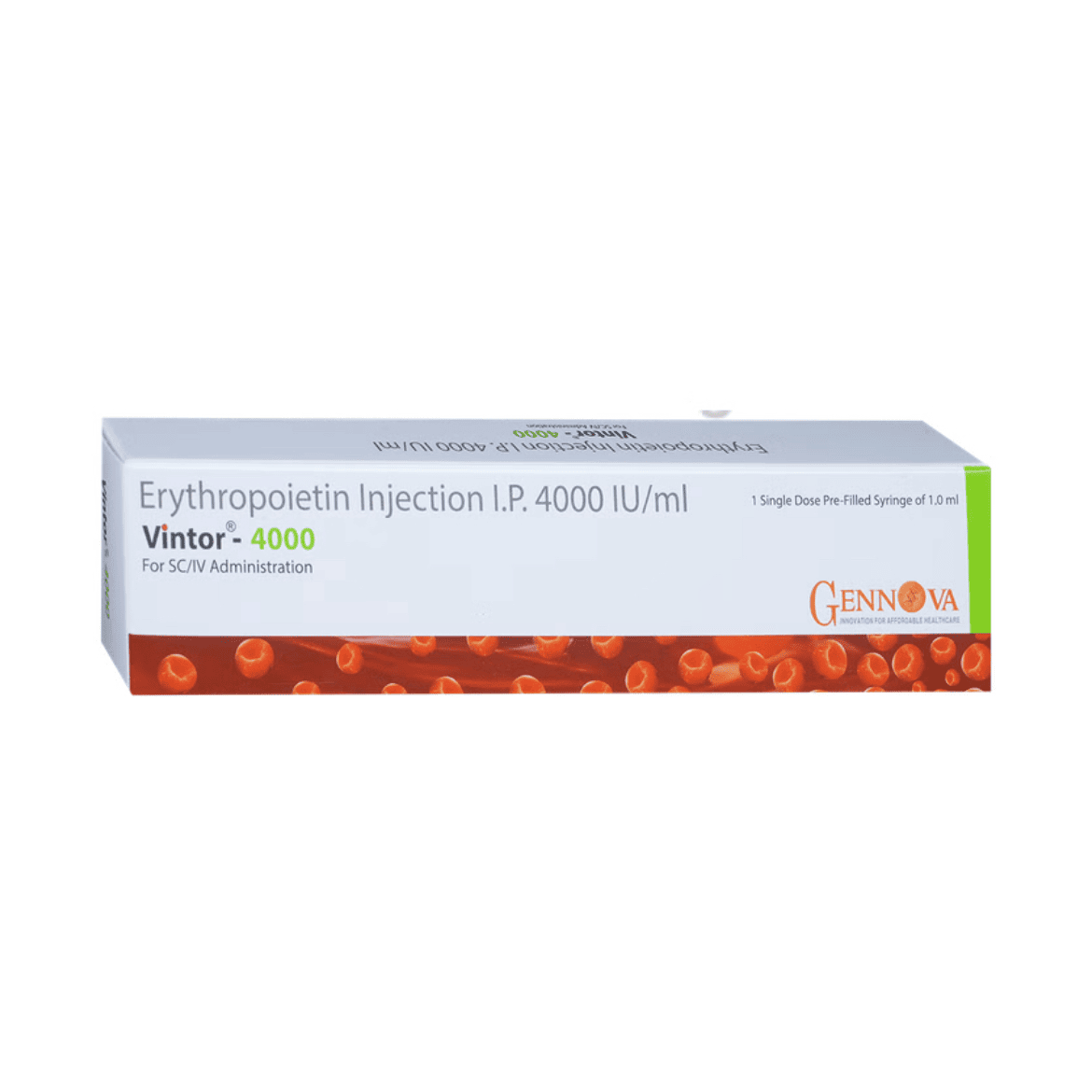 Vintor – 4000 is an Erythropoietin injection used to stimulate the production of red blood cells in the bone marrow. It is a synthetic form of the natural hormone erythropoietin, produced using recombinant DNA technology. It helps in the management of anemia associated with chronic kidney disease, chemotherapy, and certain other medical conditions.
