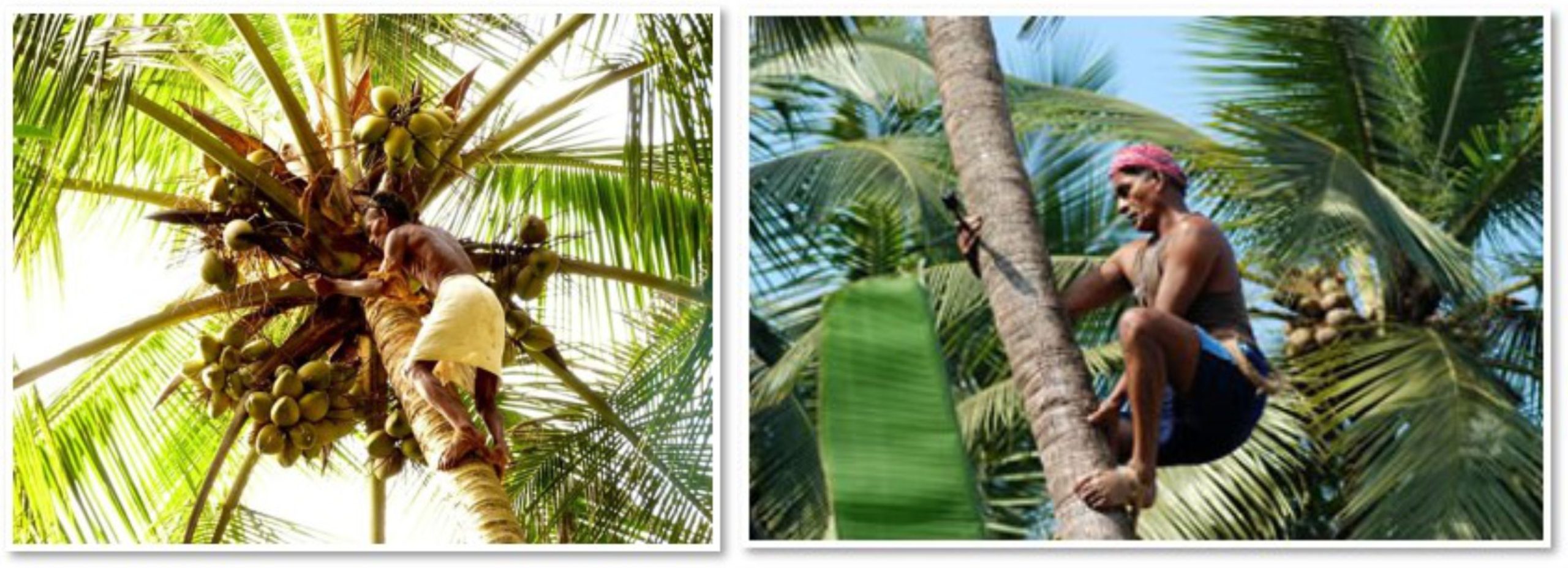 Skills in traditional methods were usually passed down from one generation to another. Here the padekar uses a rope harness ‘khaddum’ wrapped around his feet as climbing support and a machete ‘koito’ to cut notches in the tree bark which enable him to climb higher. On reaching the top, they support themselves on the base of the palm frond, sometimes even standing on them! He can then easily cut down mature or tender coconut bunches and loose palms. Plucking of coconuts was done four times a year, and the record of each plucking was kept by making incisions (katre) on the trunk with a koito.